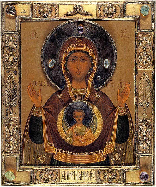 The walls were covered with Eastern-style icons that greatly appealed to me with their symmetry, symbolism, and mystical appearance. I was particularly drawn to what was explained to me as “Our Lady of the Sign,” the image of the Virgin Mary with Christ emerging out of her as a child surrounded by stars. The image seemed to be of grand cosmic scope, the exact sort of idea that I had been searching for in my spiritual journey. The icons within the church clearly represented subtle spiritual realities and were meant to uplift the soul, unlike the standard Roman Catholic artwork, which depicted earthly scenes in humanistic, Renaissance-style paintings.