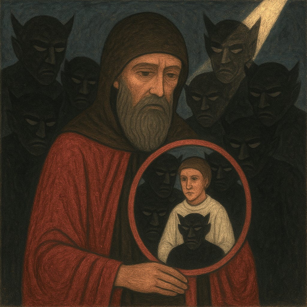 “Just as someone in the midst of a crowd, holding a mirror, and looking at it, sees not only his own face but also the faces of those looking in the mirror with him, so someone who looks into his own heart sees in it not only his own state, but also the black faces of the demons.” - St. Hesychios, Philokalia